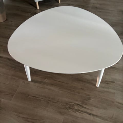 Triangulärt designsoffbord från Naver. Fint skick, finns en liten färgavskrapning på kanten, bordsskivan intakt (se bild). Nypris 20000:-