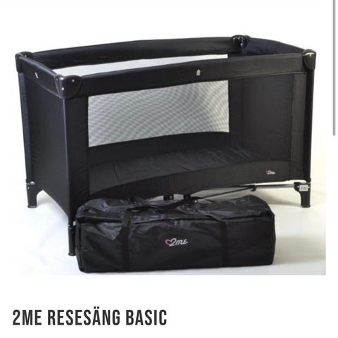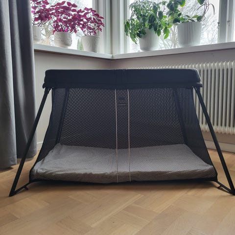 Babybjörn resesäng i blå färg. Tillverkad med nätpaneler för ventilation och sikt. Passar för barn och är utformad för enkel transport och användning vid resor.