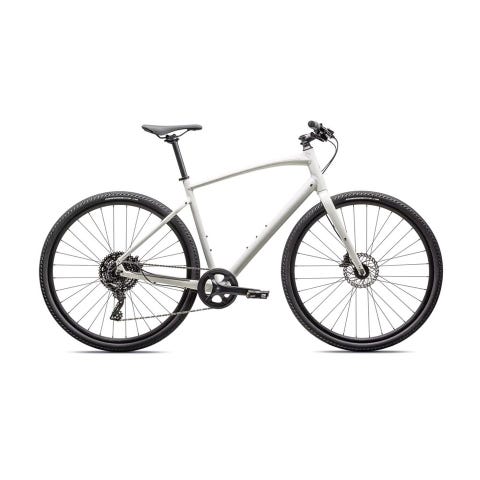 Trek hybridcykel för man med svart ram och bruna däck. Cykeln har en 9-växlad växling och är utrustad med skivbromsar. Den är anpassad för allsidig användning på både asfalt och lättare terräng.
