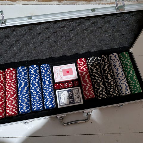 Fin väska med tillhörande pokerspel , tyvärr är 2av korten lite skavda , se bild