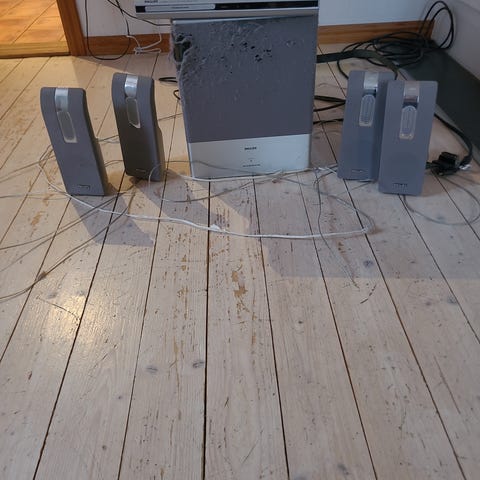 OBS(!) den ena bakhögtalaren har åkt i golvet och skorrar ordentligt vid användning. Behöver lagas / nytt element / alternativt är helt trasig.
