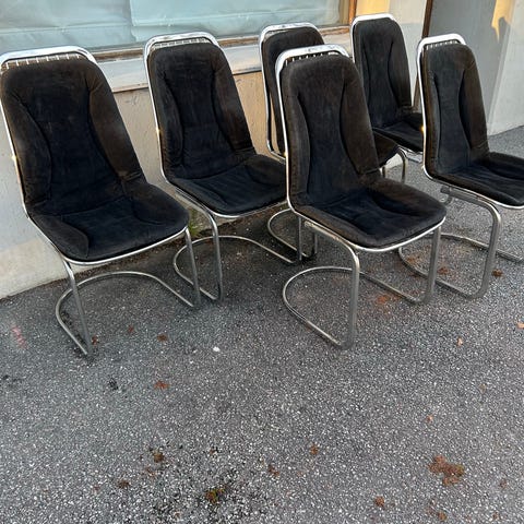 Tre retrostolar med originaldynor i svart sammetsliknande tyg. Stolarna är i krom i cool 70-talsdesign.