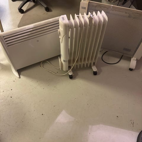 Oljefylld elementvärmare i vit färg med flera värmeelement. Utrustad med hjul för enkel förflyttning och strömkabel för anslutning till elnätet. Används för uppvärmning av mindre till medelstora rum