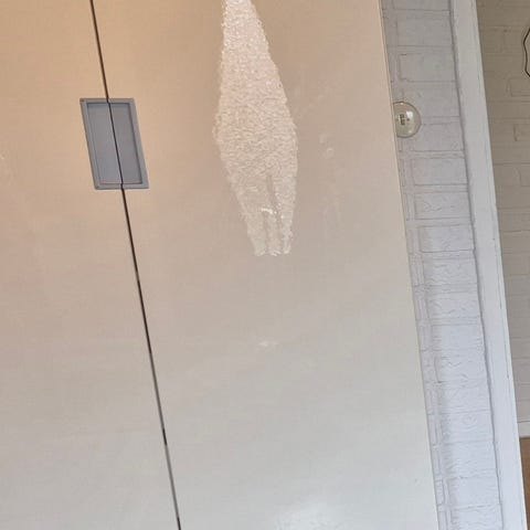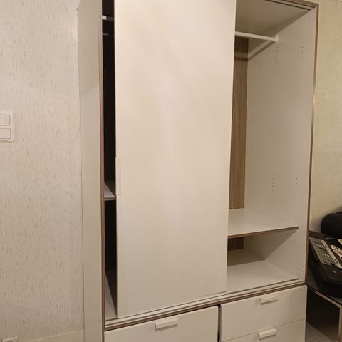 IKEA garderob med skjutdörrar i vitt och svarta handtag.