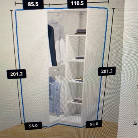 Garderoben har hyllplan och klädstång för upphängning av kläder. Vi har haft den som hallgarderob.