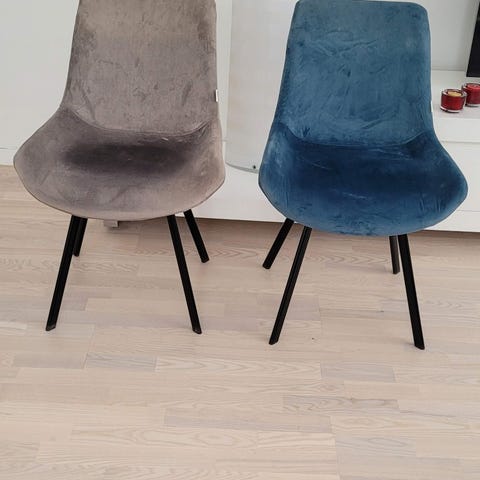 Säljer 4 st sam gråa sammetsstolar med tillhörande sittpall