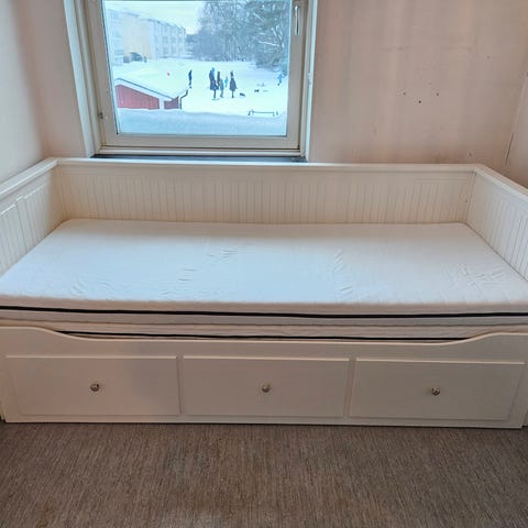 En dagbädd som kan dras ut till en praktisk dubbelsäng. Med två tillhörande madrasser. Överdragen på madrasserna är nytvättade men har ett par små fläckar som inte går bort. Annars är sängen jättefin och utan skador.
