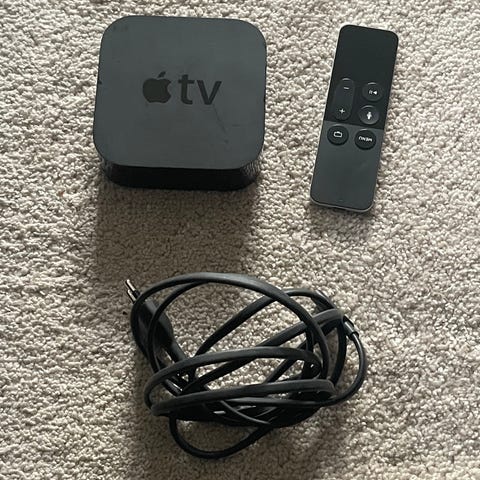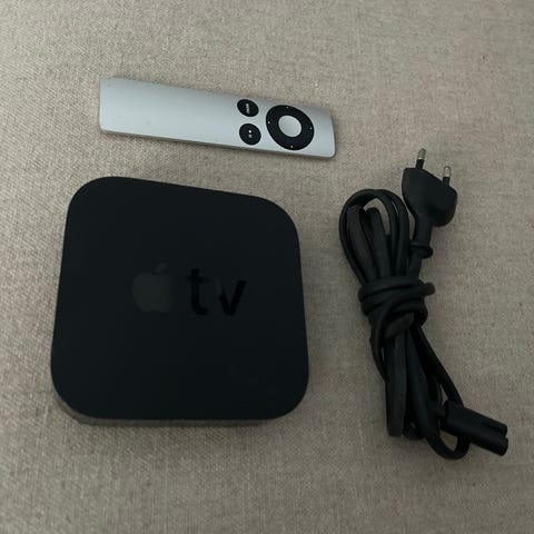 Apple TV med HDMI och Ethernet-portar. Enhet i svart färg med Apple-logotyp på ovansidan. Används för strömning av media och anslutning till TV via HDMI.