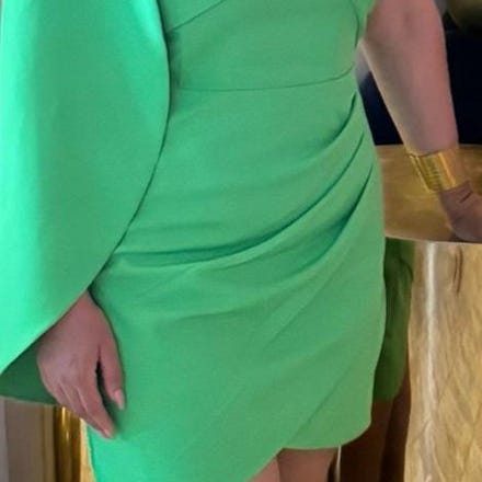 Klänningen har långa transparenta ärmar, vacker spets med blommönster och en lätt volang nedtill som ger ett mjukt och elegant fall. Perfekt för sommarfester, middagar, förlovning, baby shower eller andra speciella tillfällen.