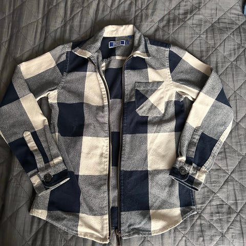 Fin, bra omhändertagen trots att den är flitigt använd. Jätteskön. Beige, vit och marinblå. Stl 140.