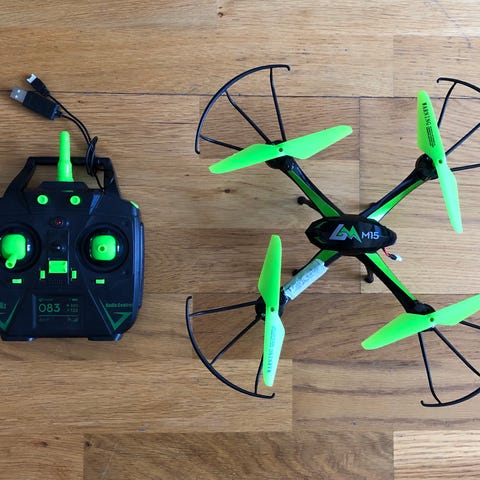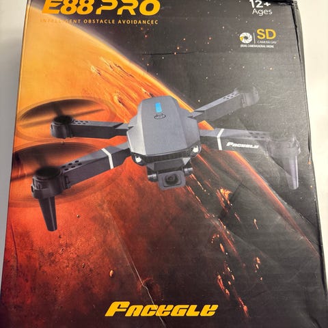 K15W Drönare i vit färg med fjärrkontroll. Utrustad med fyra propellrar och LED-ljus. Lämplig för inomhus- och utomhusbruk.