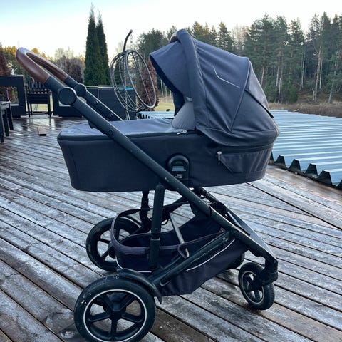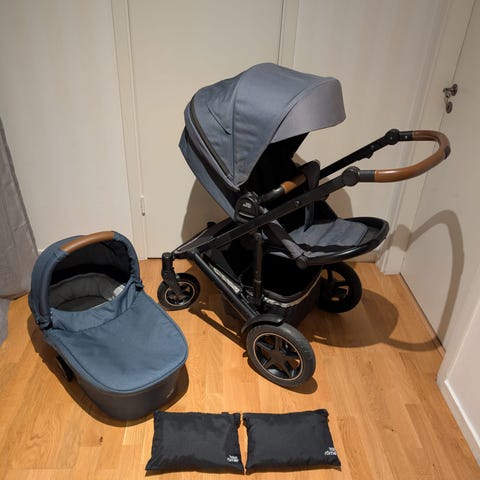 Britax barnvagn 5z med sittdel och liggdel i mörkblått. Vagnen har bruna handtag. Jättefint skick! Liggdelen är nästan inte använd, så skicket på hela barnvagnen är väldigt bra. Den är använd till ett barn, därav skicket.