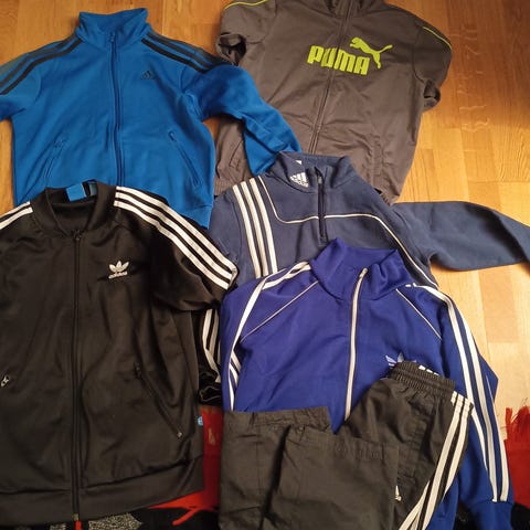 Adidas Real Madrid träningsställ i barnstorlek 152. Setet består av en vit jacka och matchande byxor med Real Madrids emblem och Adidas logotyp.