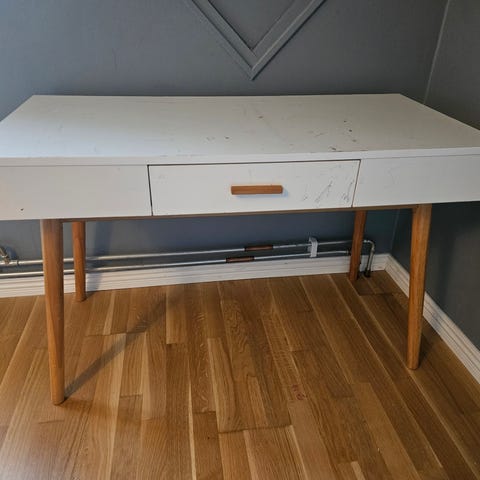 Skrivbordet är köpt på Jollyroom. Skrivbordet och stolen är rosa (svårt att få rätt färg på bilderna). Skrivbordet har en låda och hyllor för förvaring. Skrivbordet och stolen är lite skavt och det finns färg på skivan som vi inte får bort.