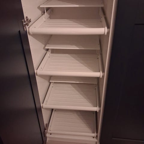 IKEA KOMPLEMENT skohylla för garderob med metallram och plastdetaljer. Designad för att organisera och förvara skor i garderoben. Passar som en del av IKEA garderobssystem (PAX).