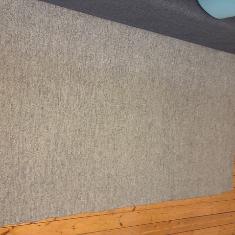 Säljer en rund, grå matta med kort och mjuk lugg. Luggen dämpar ljud och är mjuk att gå på.