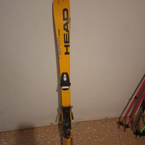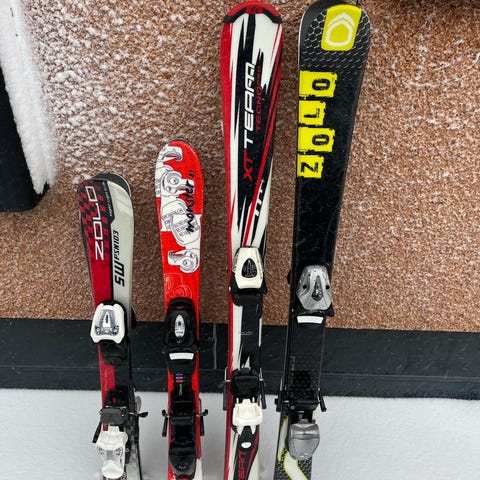 Slalomskidor röd Atomic 110 cm 150 kr, slalomskida blå K2 twintip 119 cm 250 kr, pjäxor Fischer 293 mm 300 kr, pjäxor Lange 290 mm 250 kr