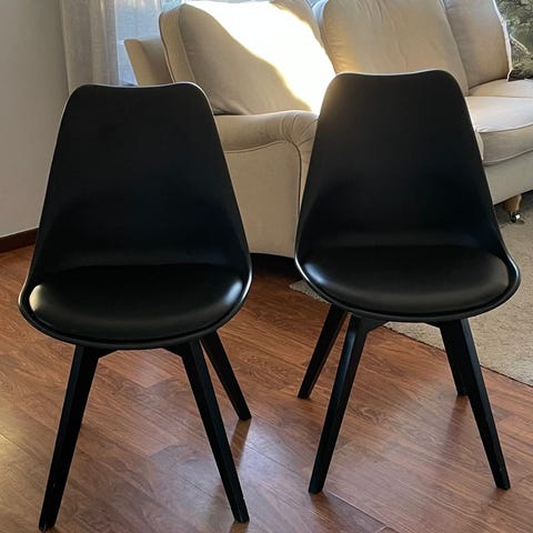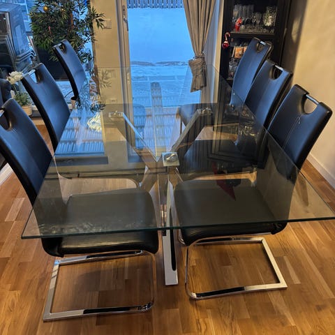 Matgrupp med 4 st stolar. I metall & trä,stolar i skinn imitation. Nyköpt på Mio 2021.