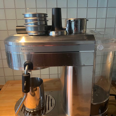 En espressomaskin med allt man behöver. Vattenbehållare, mjölkskummare. Funkar hur bra som helst.