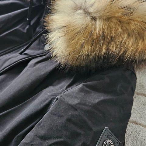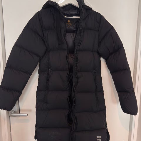 Kappan har snygga detaljer. Rak modell. Lätt och varm. Huva med fina band och trä detaljrr.