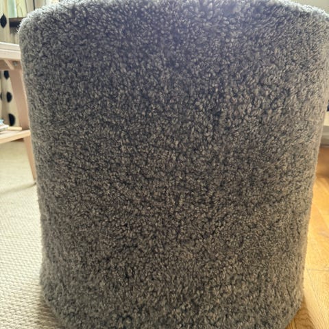 Fotpall med trästomme och fårskinn och grått tyg på sidorna. Pallen har en mjuk, vadderad sits och är utformad för sittkomfort. Passar som fotpall eller extra sittplats i olika miljöer.