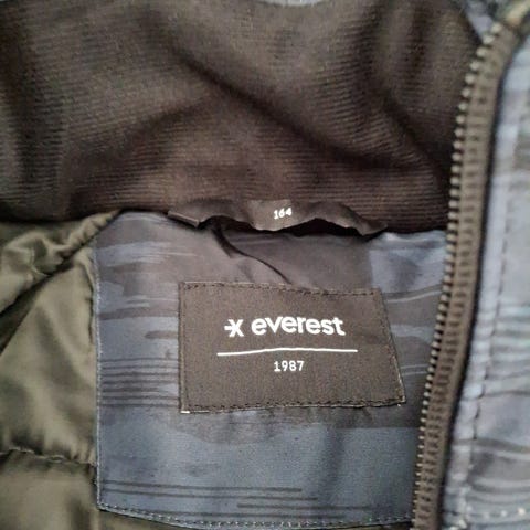 Everest barnjacka i storlek /158164, färg svart. Tillverkad i polyestermaterial. Passar för pojkar. Waterproof se etikett. Sparsamt använd. Passar som vår eller höstjacka eller som tunnare vinterjacka. Två fickor på framsidan.