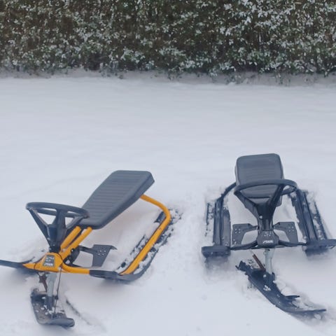 Stiga Snow Racer med blått säte och ratt, metallram och plastskidor.