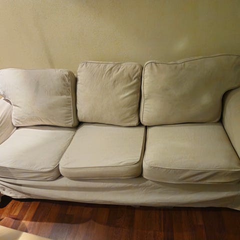 Soffan är i gott skick utan kända skador. Tyget är helt, inga hål eller revor. Hemmet är rök- och djurfritt.