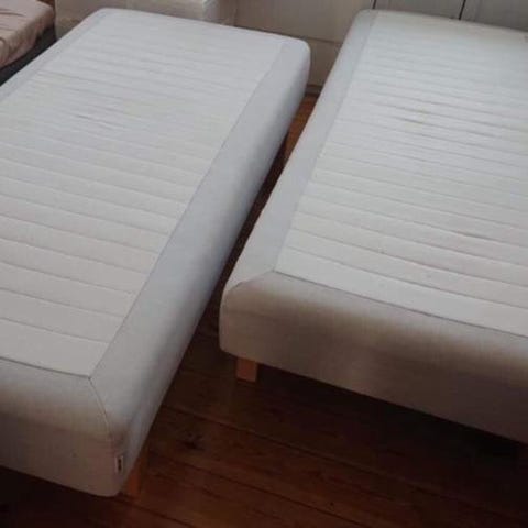 Ny säng knappt använd 90cm. Ingår komplett med ben, sängbotten och 2st madrasser.