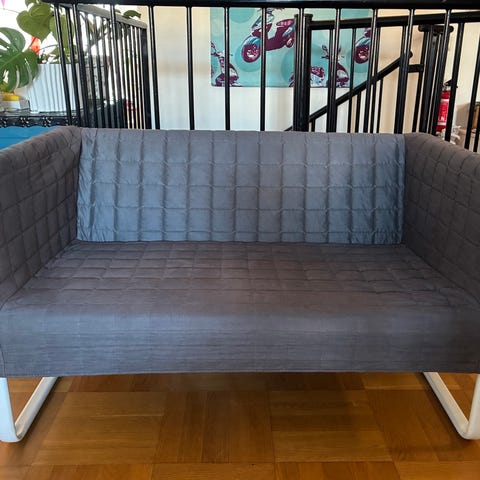 Klassisk Erikstorp soffa från IKEA i brun klädsel. En uppsättning vita överdrag följer med.