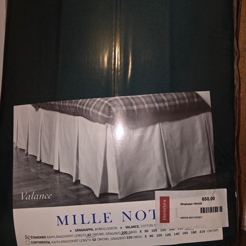 Jag säljer min sängkappa i märket Mille Notti som är i gott skick och endast använd vid ett tillfälle. Sängkappan har dekorativa slitsade veck i färgen offwhite/beige. Tyget är i enfärgat canvas 100 % bomull. Sängkappan är tvättad men på sängkappans botten finns några mindre fläckar.