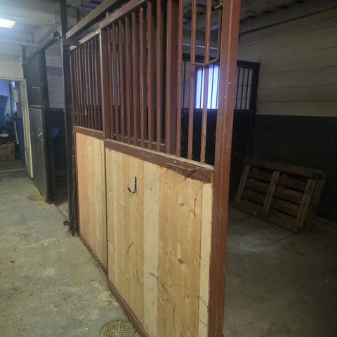 Galler till hästboxar. 3 mellanväggar och frontgaller till 4 boxar. Allt i bra skick, men behöver slipas/blästras och målas.