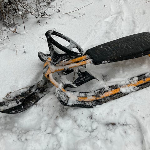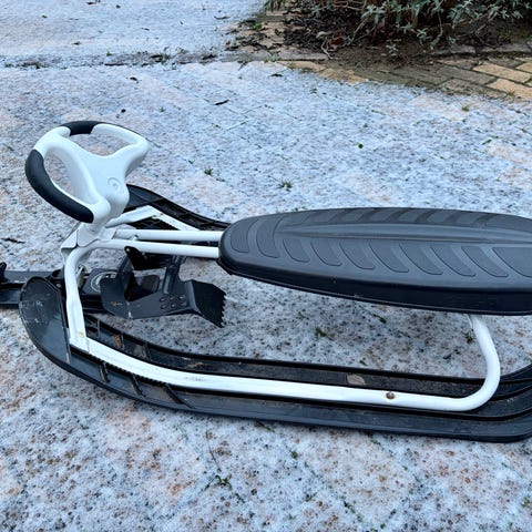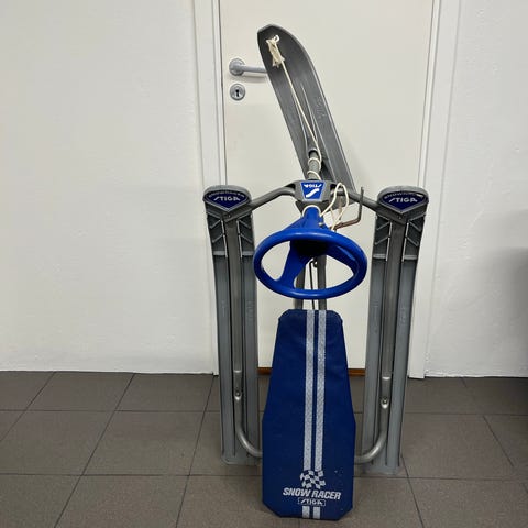 Klassisk Stiga snowracer med fotbroms. Allt fungerar utom den automatiska snörvindan, men det går lika bra att linda dragsnöret runt ratten när man ska åka. Skickas ej, hämtas i centrala Halmstad eller Älmhult.