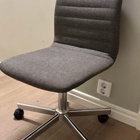 Fin och smidig kontorsstol från Jysk i grått tyg. Maximal höjd på sitsen är 53 cm.