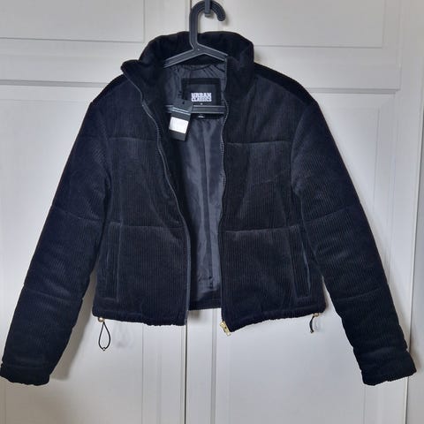 jacka dam i storlek M från Urban Classic. Jackan är beige . Den har huva och dragkedja framtill.