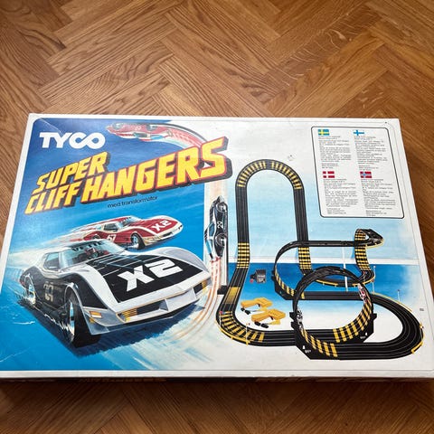 Club Circuit Scalextric bilbana inklusive olika spårdelar, korsningar, kontrollenhet, en bil och tillbehör. Material och storlek är inte specificerade. Produkten är avsedd för lek och samling. Köpt 1990 och kompletterad med mer delar under årens gång. Fungerar men kan behöva lite kärlek