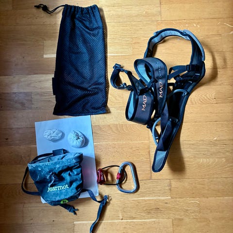 Mad Rock klättersele med tillbehör inklusive kritpåse, kritboll och karbinhakar. Selen är justerbar och gjord för att användas vid klättring.