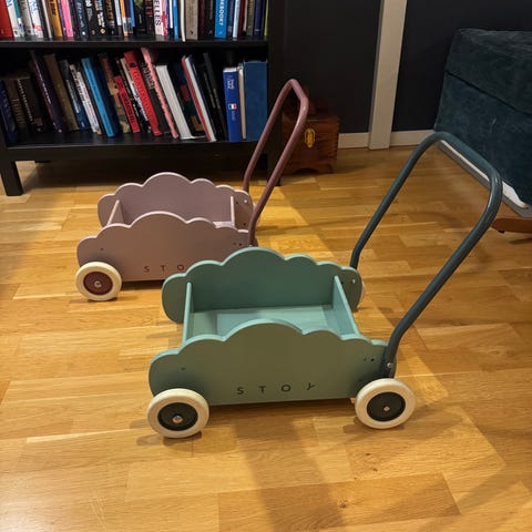 Grön lära gå vagn från Done by Deer. Bra stöd för ditt barn när det är dags att lära sig gå. Även kul leksak. Kostat cirka 900kr som ny.