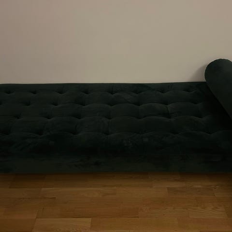 Klassisk dagbädd, valnötsfärgad, från Sofacompany med en grå avtagbar klädsel.