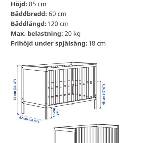 Helt ny spjälsäng, lite märke efter flytt. Ingår madrass även påslakan om man vill ha det till. Den ena sidan har jag inga skruvar till att skruva fast andra sidan