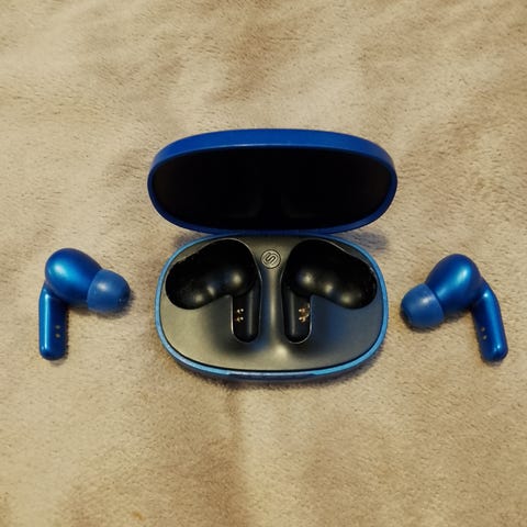 Urbanista Los Angeles med solceller som laddar hörlurarna. Fodral medföljer. Laddas med vanlig USB-C sladd vid behov men de laddar sig själva vid exponering för ljus.