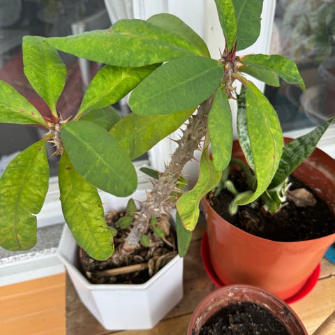 Grön växt med långa smala blad, ev kallad svärmorstunga. Lättskött. Har stått med mycket lite ljus och klarat sig bra.