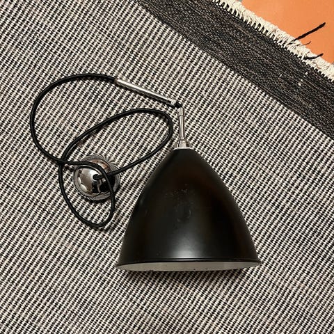 Liknande Gubi semi-pendeln. Bra använt skick, lite vågig i kanten, inget som inte kan snyggas till om man vill. Några mindre märken, se bilder för egen bedömning av skick. Ny takkontakt monterad. Större modellen, 46,5 cm diameter.