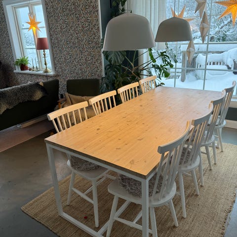 Unikt industriellt matbord, med massiv träskivad med patina. Benen är metall och går att fälla ihop. 183 långt 92 brett 76 högt.