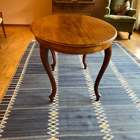 Antikt runt bord tillverkat i trä med detaljerad snideri på benen och kanterna. Bordet har en mörk träfinish och en robust konstruktion. Passar som matsalsbord eller dekorativt möbel i vardagsrum.