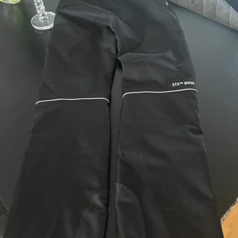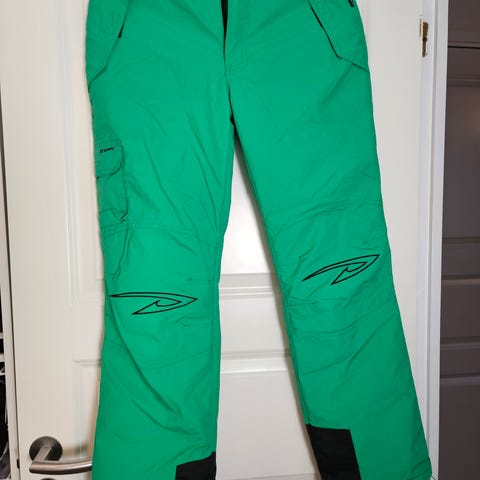 Varmfodrade skidbyxor, två fickor med dragkedja, reflexrand baksida ben, snölås samt avtagbara hängslen.