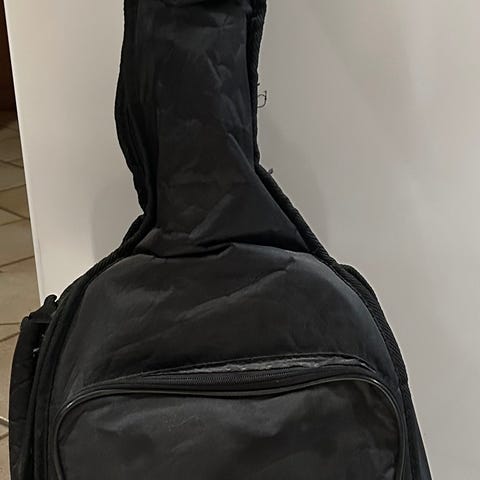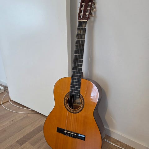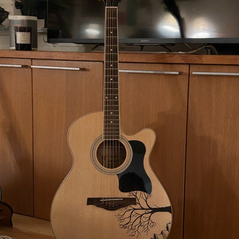 Akustisk gitarr med tillhörande fodral och notställ. Gitarren är av standardstorlek och lämplig för olika spelstilar. Fodralet skyddar gitarren vid transport och förvaring. Notstället är justerbart och användbart för att hålla noter eller tabulatur under spelning.