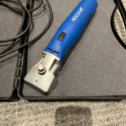 Sladdlös Kraftfull batteridriven klippmaskin med dubbel uppsättning skär. Använd under 4 år på tre hästar. Inköpt på Lyckliga fåret. Väldigt bekväm att använda då man slipper sladden.