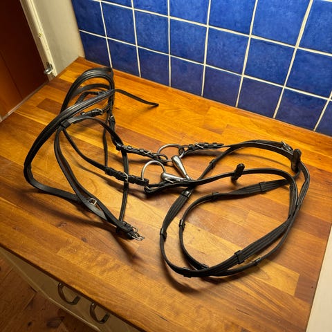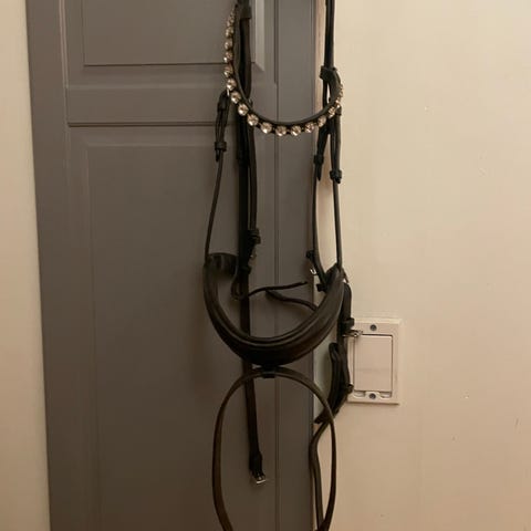 Vackert Rundsytt Otto Schumacher träns med vitfodrad nosgrimma och klassiskt pannband med stenar. Använt i 2 år på en häst.