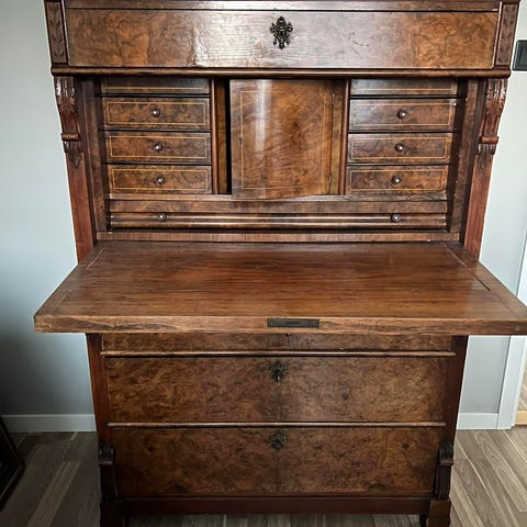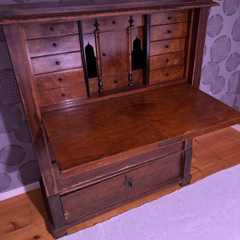 Vi säljer min farmor och farmars gamla chiffonjé till högst bjudande pris. Tillverkad (ca) tidigt 1900 tal. Ganska tung då den är i massivt trä.